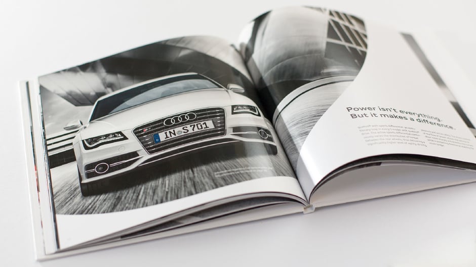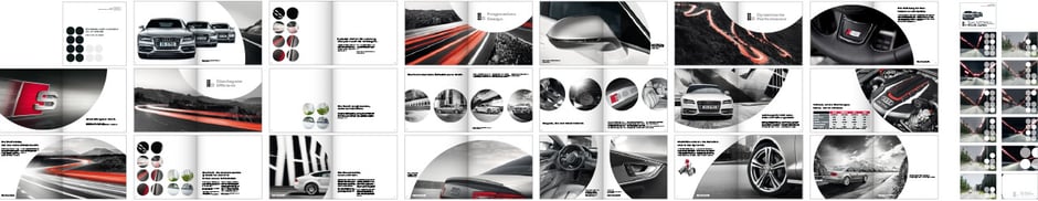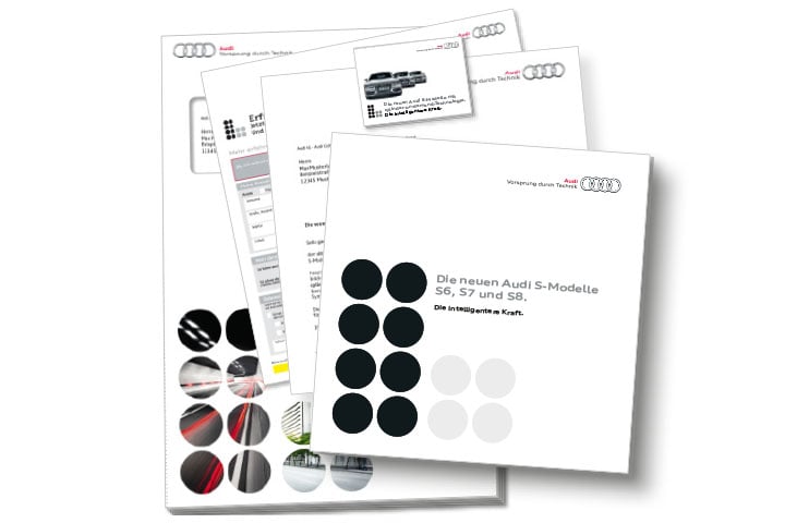 Die neuen S-Modelle von Audi verfügen über 8 Zylinder. Wird nicht die ganze Kraft der 8 Zylinder benötigt, schalten die Motoren auf sparsamen 4-Zylinder-Betrieb um. Wir stilisierten den 4- und 8-Zylinderbetrieb und schufen so eine visuelle Grundlage für die einzelnen Kommunikationsbestandteile.