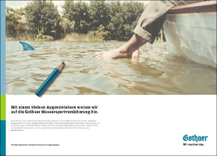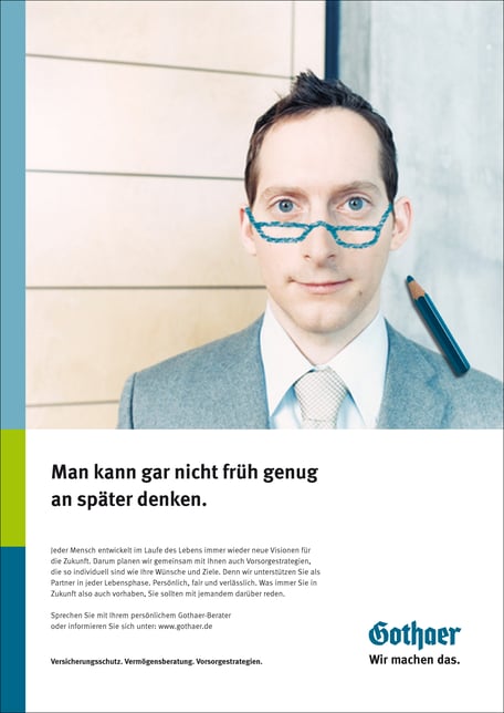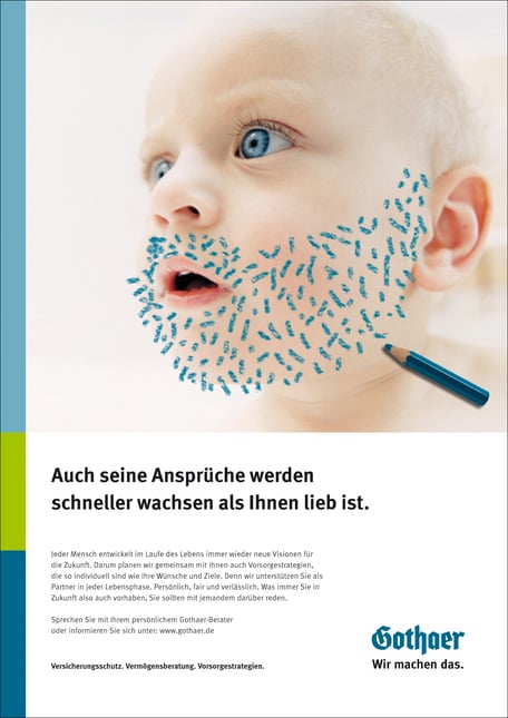 Gothaer benötigte einen neuen Markenauftritt. Das volle Programm – von der Image-Kampagne bis hin zum kleinen Infoflyer. Dafür benötigten wir ein starkes und einfaches Konzept: Wir machen die Träume, Visionen und Pläne der Menschen sichtbar. In welcher Szenerie wir uns auch befinden, wir malen die Gedanken der Menschen mit einem Stift hinein – in Gothaer-Blau. Und wir gehen diese Ziele gemeinsam an. Wir machen das.