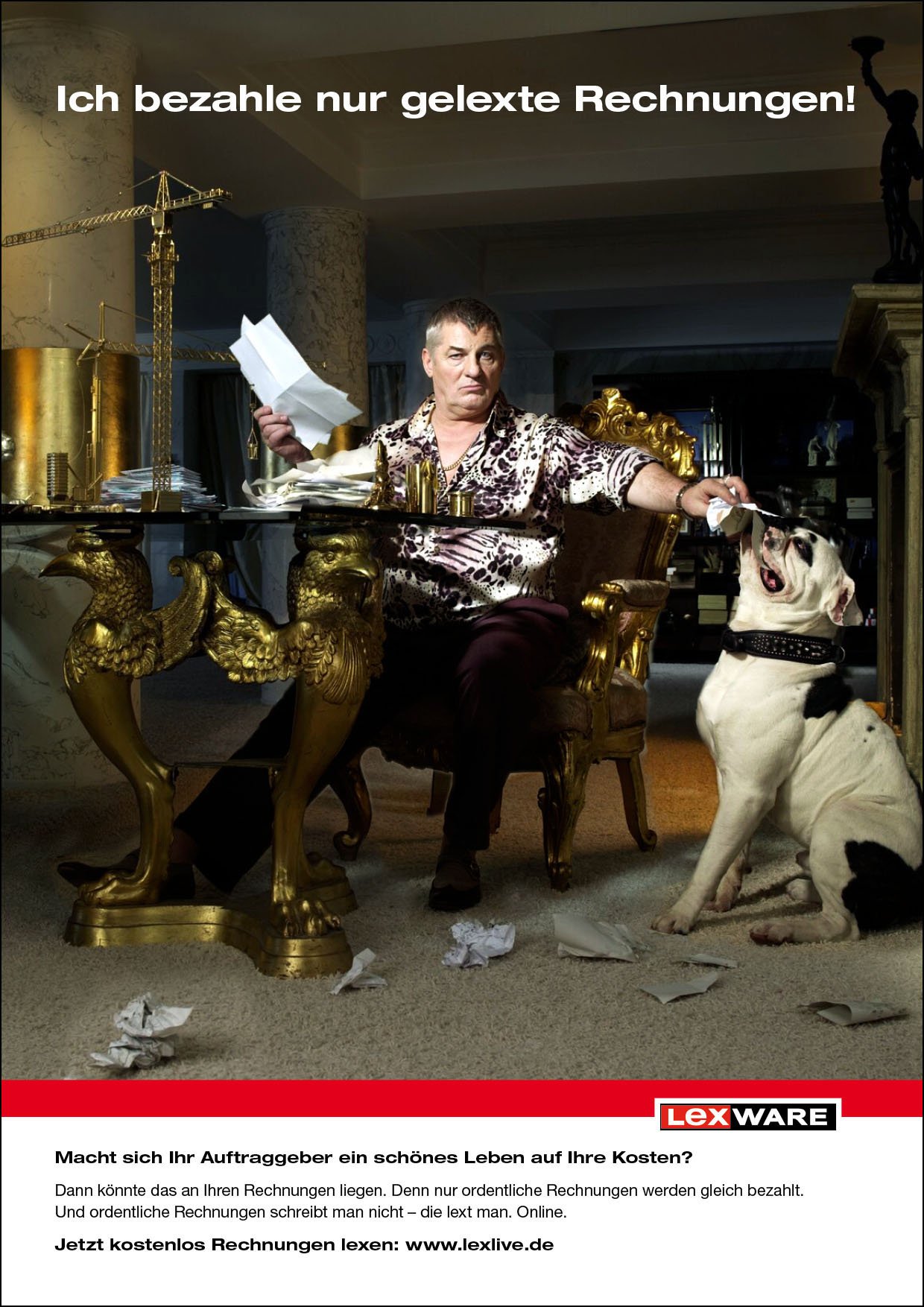 Um es jedem zu ermöglichen, unanfechtbare Rechnungen zu schreiben, bietet Lexware einen Online-Service zum rechtssicheren Verfassen von Rechnungen an.Denn viele Unternehmen zahlen nur absolut einwandfrei verfasste Rechnungen. Da genügt schon ein kleiner Fehler und man bekommt sein Geld nicht. Wir inszenieren den Prototypen eines unwilligen Rechnung-Begleichers: Einen schmierigen Baulöwen. Dieser Unsympath stellt alles mögliche mit den an ihn gestellten Rechnungen an – nur bezahlen ist ihm fremd.