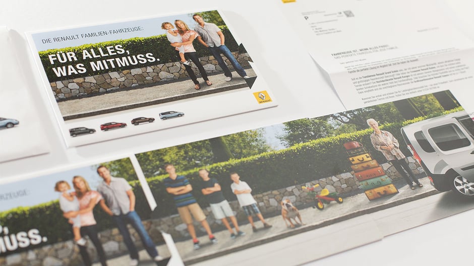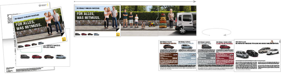 Renault hat viele Fahrzeuge, die sich hervorragend für Familien eignen. Egal wie groß diese Familien sind. Diese Bandbreite zeigen wir in unserem Mailing. Mit einer Teleskopmechanik machen wir aus einer Standardfamilie mit zwei Elternteilen und einem Kleinkind eine sechsköpfige Familie mit Hund und dazugehörigem Gepäck.
