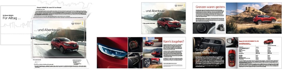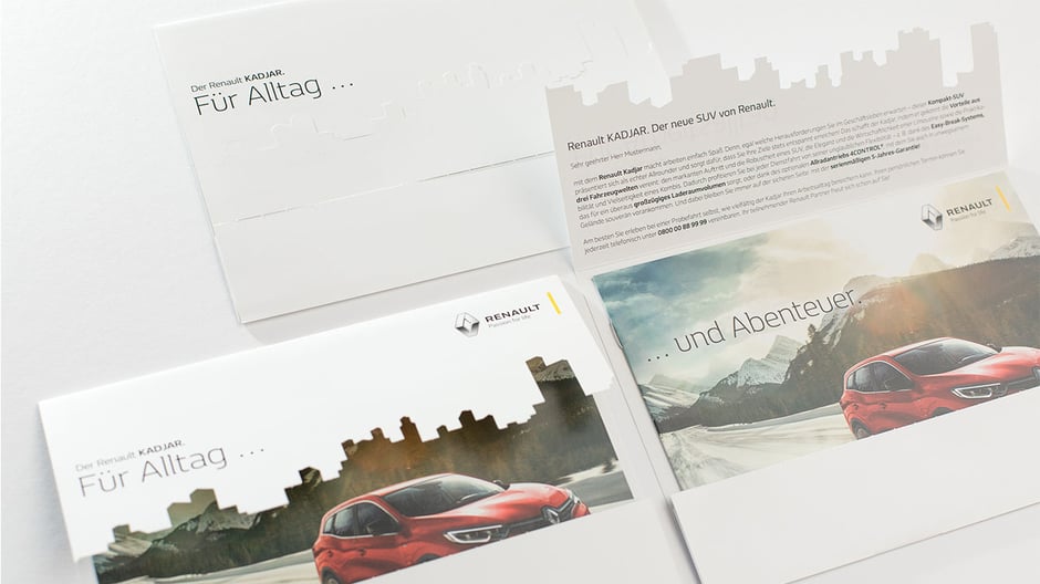 Der Renault Kadjar ist ein klassischer SUV. Er kann Gelände, wird aber in erster Linie in der Stadt gefahren. Diese Ambivalenz setzten wir in einem Selfmailer um. Wir machten aus ungezähmter Natur eine urbane Skyline. Öffnet man den Selfmailer an den vorgegeben Perforationslinien, trennt man eine urbane Skyline heraus und sieht durch diese Skyline den Kadjar durch die Natur fahren.