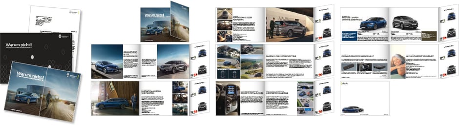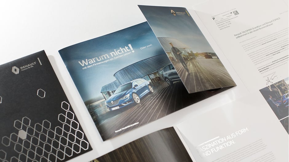 Renault wollte die für Firmenkunden besonders attraktiven Fahrzeuge Talisman und Espace in einem gemeinsamen Mailing bewerben. Der Talisman ist eine Ansage. Er macht sich auf jedem Firmenparkplatz gut. Noch besser, wenn neben ihm nicht irgendein anderes Fahrzeug steht sondern ein Espace. Um die Eleganz der beiden Renault-Modelle zu unterstreichen wurde der A4-Folder auf metallenem Hochglanzpapier gedruckt. Hinter einem halbseitige Titel-Klapper verbirgt sich der Espace.
