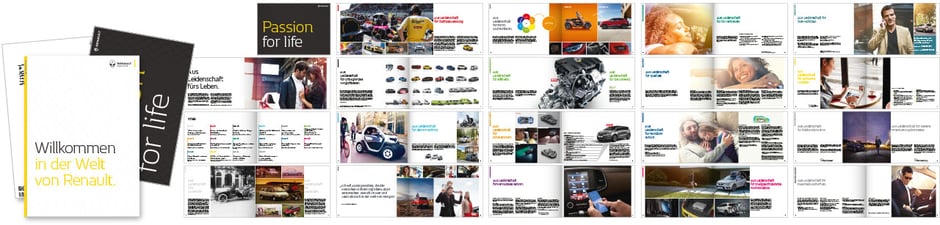 Renault möchte jedem Käufer beim Kauf ein wertiges Welcome Pack überreichen. Dazu laden wir den Claim „Passion for life“ mit allem auf, was die Marke Renault zu bieten hat. In einem edlen Buch,